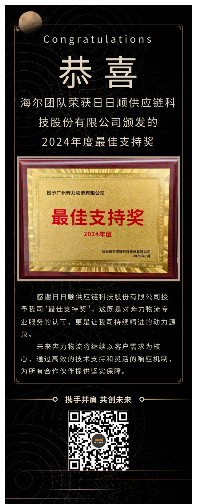 喜讯!奔力物流荣获“最佳支持奖”2025-04-01