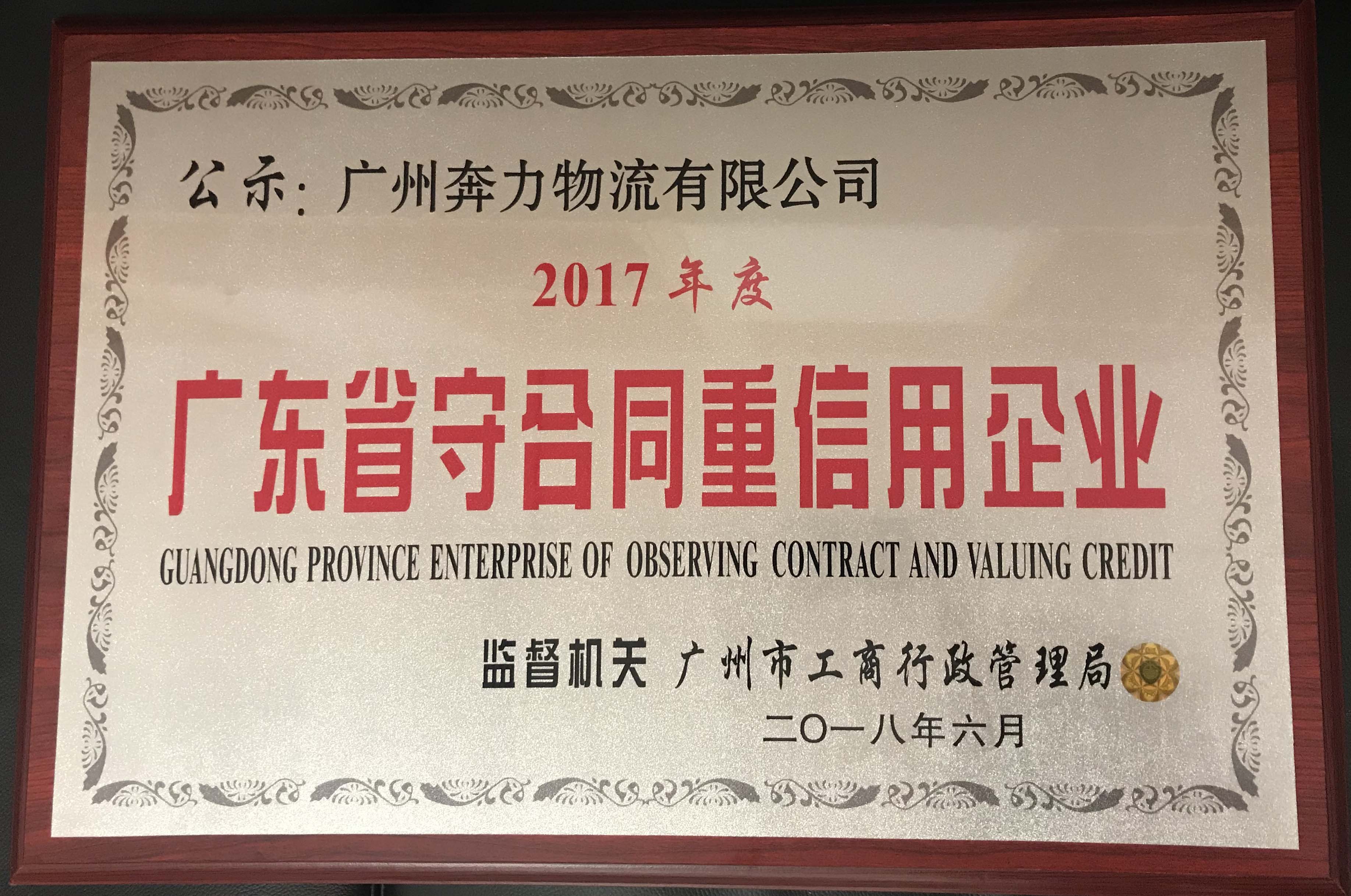 热烈祝贺广州奔力物流有限公司被广州市工商行政管理局评为“广东省守合同重信用企业”。